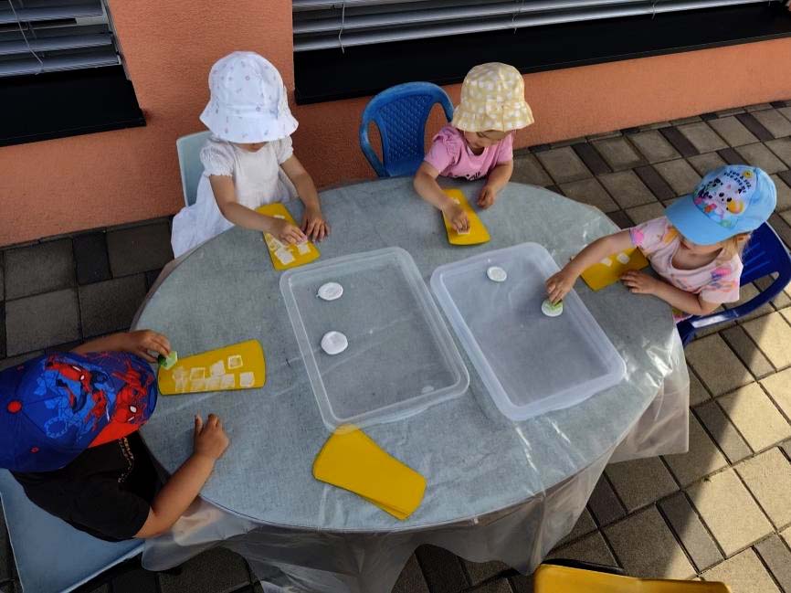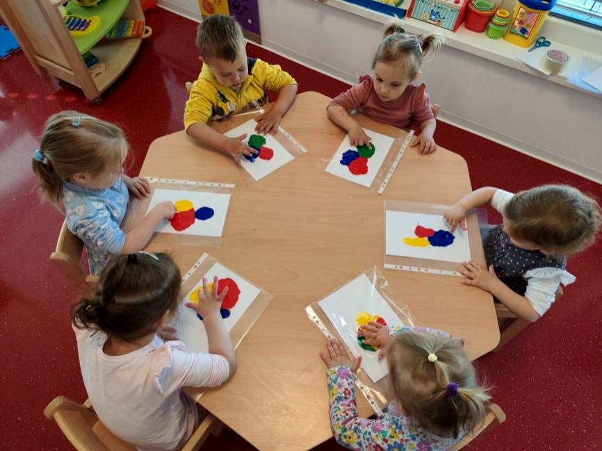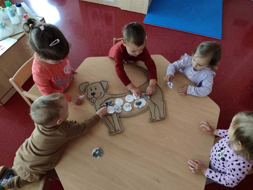 Pjevali smo i druge pjesmice kao što je pjesmica Bingo, čitali smo priču Mali pas Rudi, ali smo i izradili zajedničku likovnu aktivnost svog Rudija. Slikali smo prstima, kapali boje pipetama, otiskivali spužvicama.