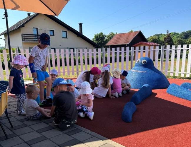 Na dvorištu vrtića često nas posjete naši najstariji prijatelji iz vrtića, naše Žabice, igraju se s nama, čuvaju nas, igramo se lovice, loptamo se i pjevaju s nama.