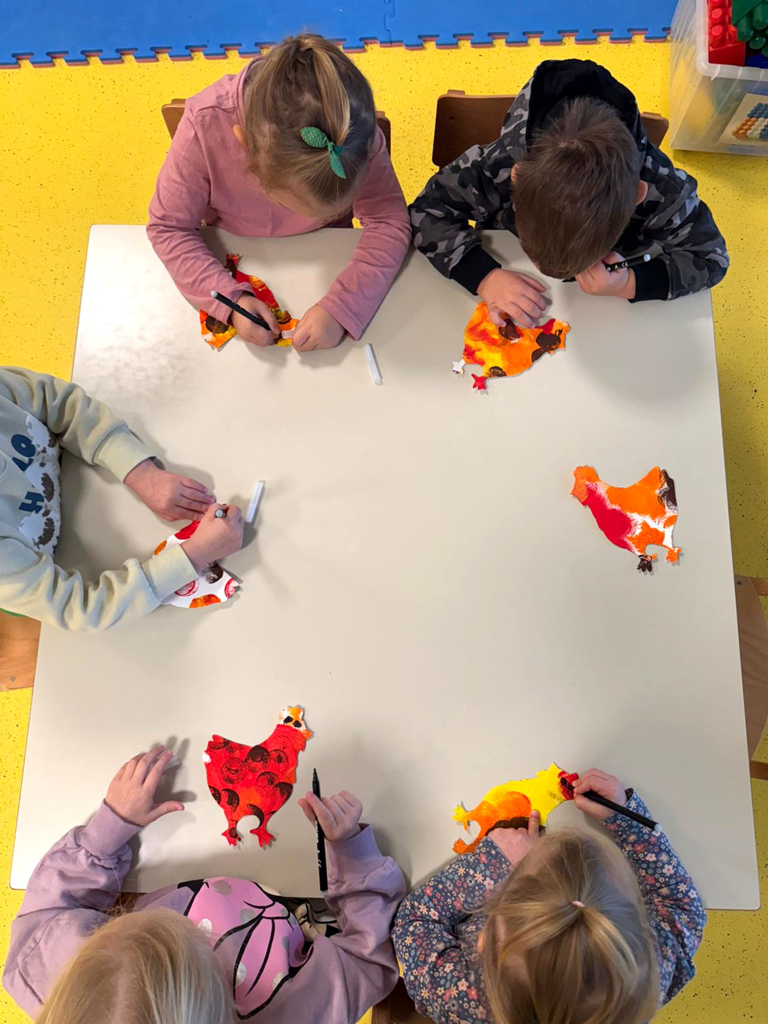 Svakodnevno smo provodili likovne aktivnosti potičući dječje istraživanje materijala, razvoj fine motorike i kreativnosti. Djeca su slikala i bojala temperama, izrezivala i lijepila kolaž papir, otiskivala oblike spužvicama, bojala bojicama i provlačila špagu kroz rupice.