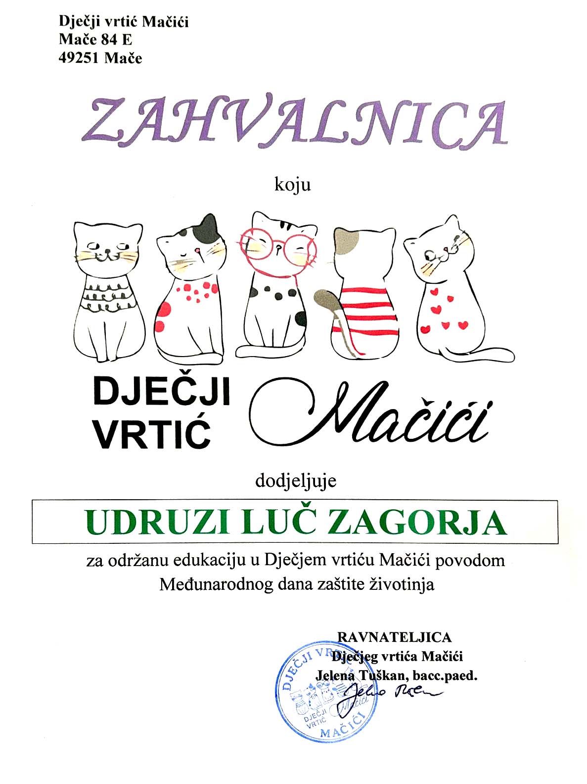Povodom Međunarodnog dana zaštite životinja, koji se obilježavao 4. listopada, Dječji vrtić Mačići i Udruga Luč Zagorja organizirali su prigodno edukativno druženje za djecu predškolskog uzrasta. Naime, u goste nam je došla gđa Mirjana Zajec koja je djeci približila važnost brige za životinje i zaštite njihovih prava. Tijekom ovog susreta, djeca su imala priliku:
