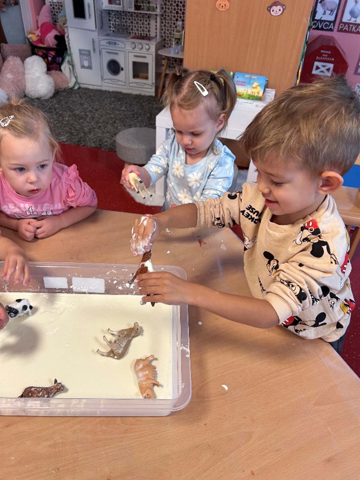 Oformili smo centar farme i puno istraživali o farmi i domaćim životinjama. Uvođenjem novog centra djeci je pružio puno mogućnosti za simboličku igru, učenje, istraživanje kroz pokret, zvuk i dodir. Usvojili smo neke nove riječi, saznali kako se zovu životinje na farmi, njihova mladunčad, što vole jesti te kako se koja životinja glasa.